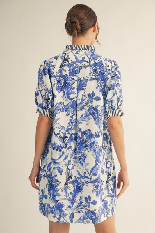 Short sleeves tropical floral dress with stripe contrast,