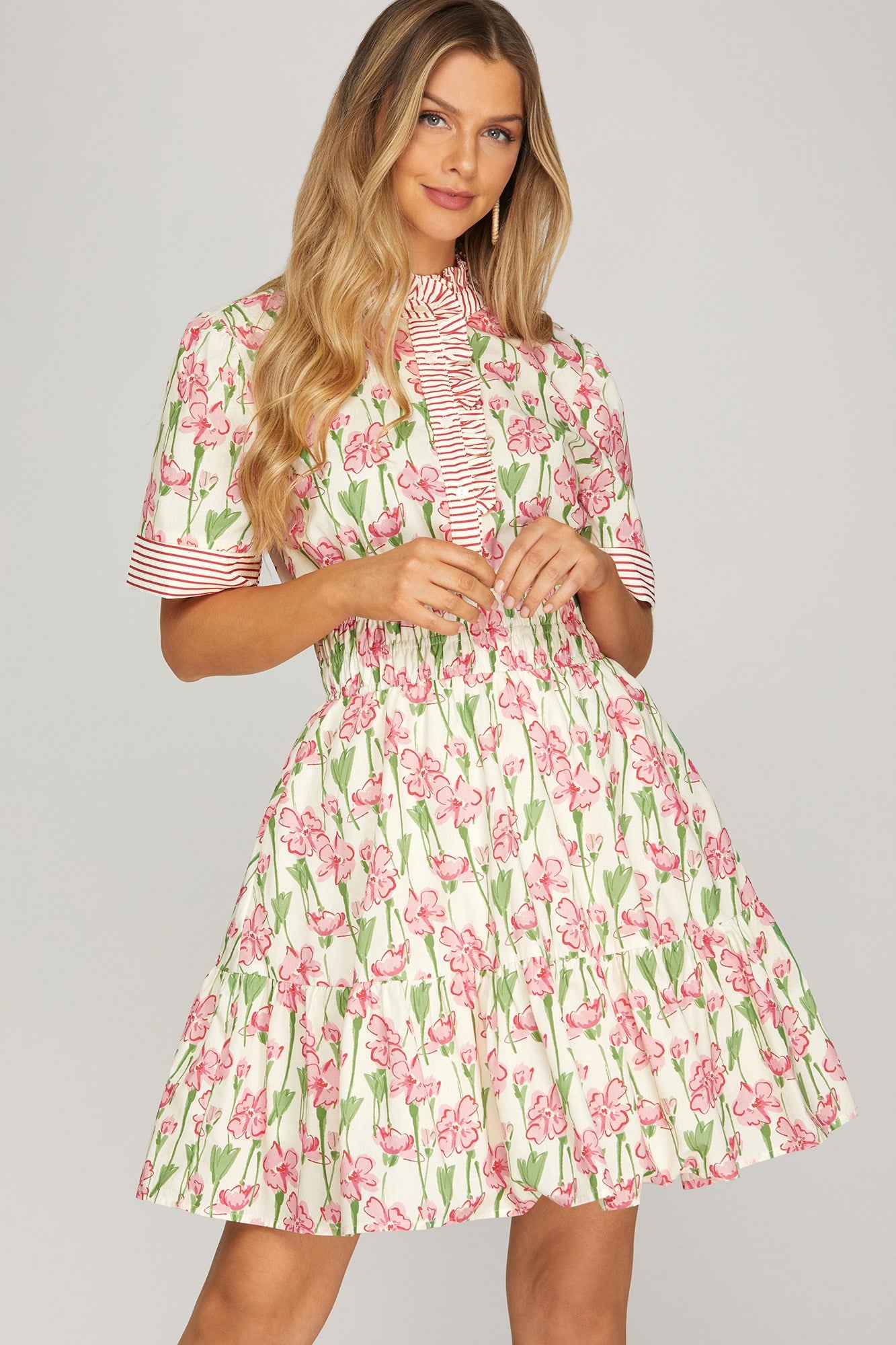 HALF SLEEVE CONTRAST RUFFLE NECK FLORAL PRINT WOVEN MINI DRESS WITH ELASTIC WAISTBAND AND POCKETS