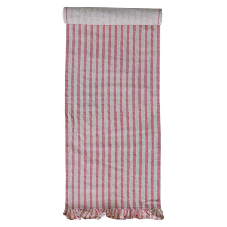 This is an absolutely adorable table runner. The soft hues are a perfect pop of color for any home. Use it for the Spring, Summer and Valentines Day. The delicate ruffle on the ends gives it an updated look.