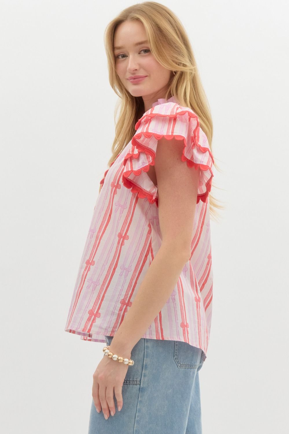 Bow print double layer flutter sleeve pullover top featuring contrasting front neck panel accented with scallop edge finish. Unlined. Woven. Non-sheer. Lightweight.
