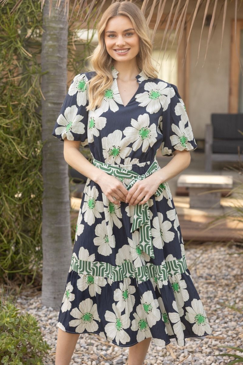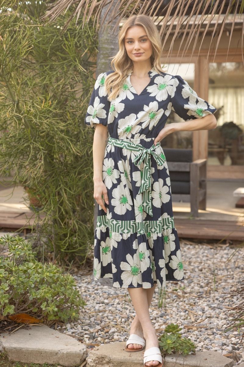 This dress is amazing.  The bold navy and green print stands out.  The contrasting fabrics and belt gives this dress an elevated look.  Its perfect for a casual get together or a day at the winery.  It has an eleAstic waist with a contrasting tie belt.