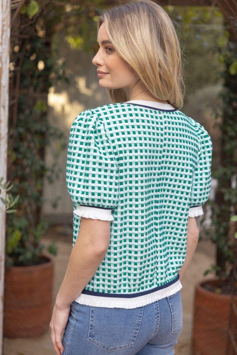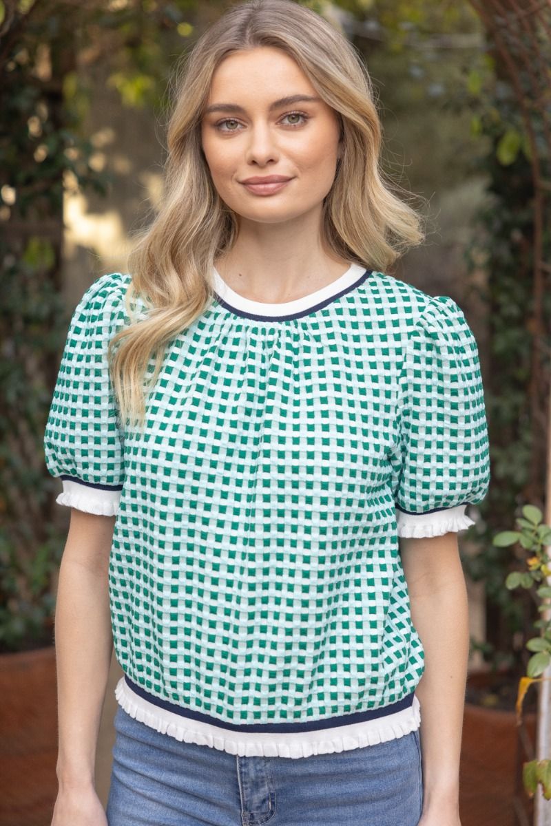 How adorable is this top.  The colors and contrasting patterns will elevste any outfit.  The band waistline gives this a fun casual look.
