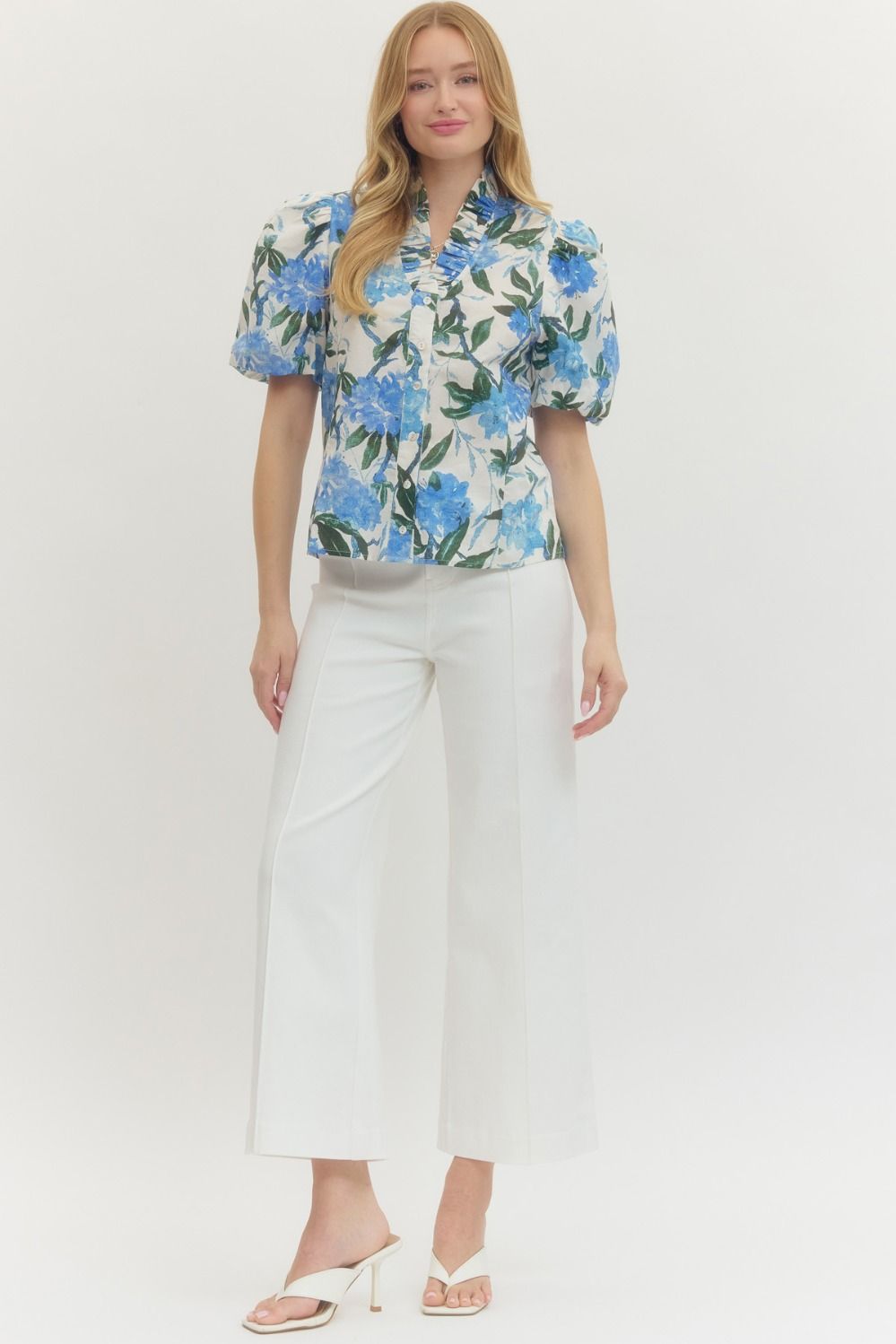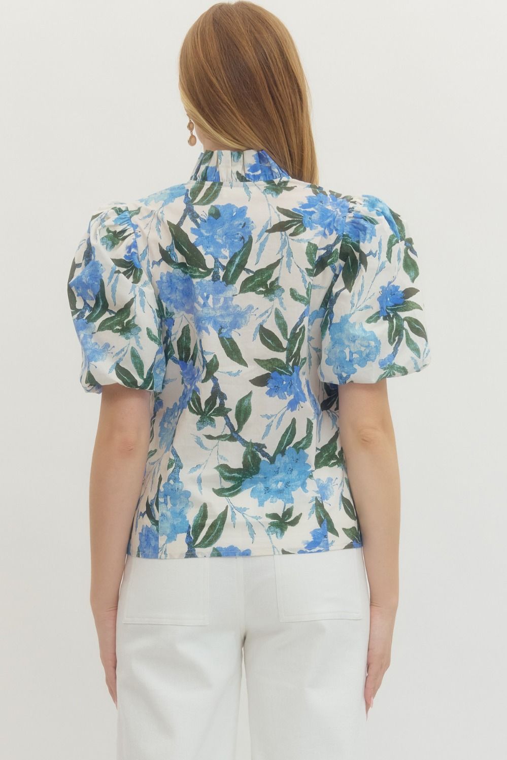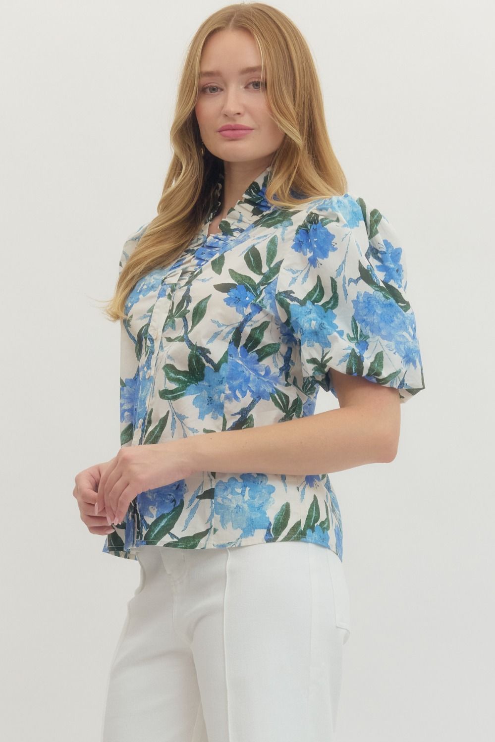 Floral print short puff sleeve top featuring ruffled V-neck collar. Button closure at front. Unlined. Woven. Non-sheer. Lightweight.