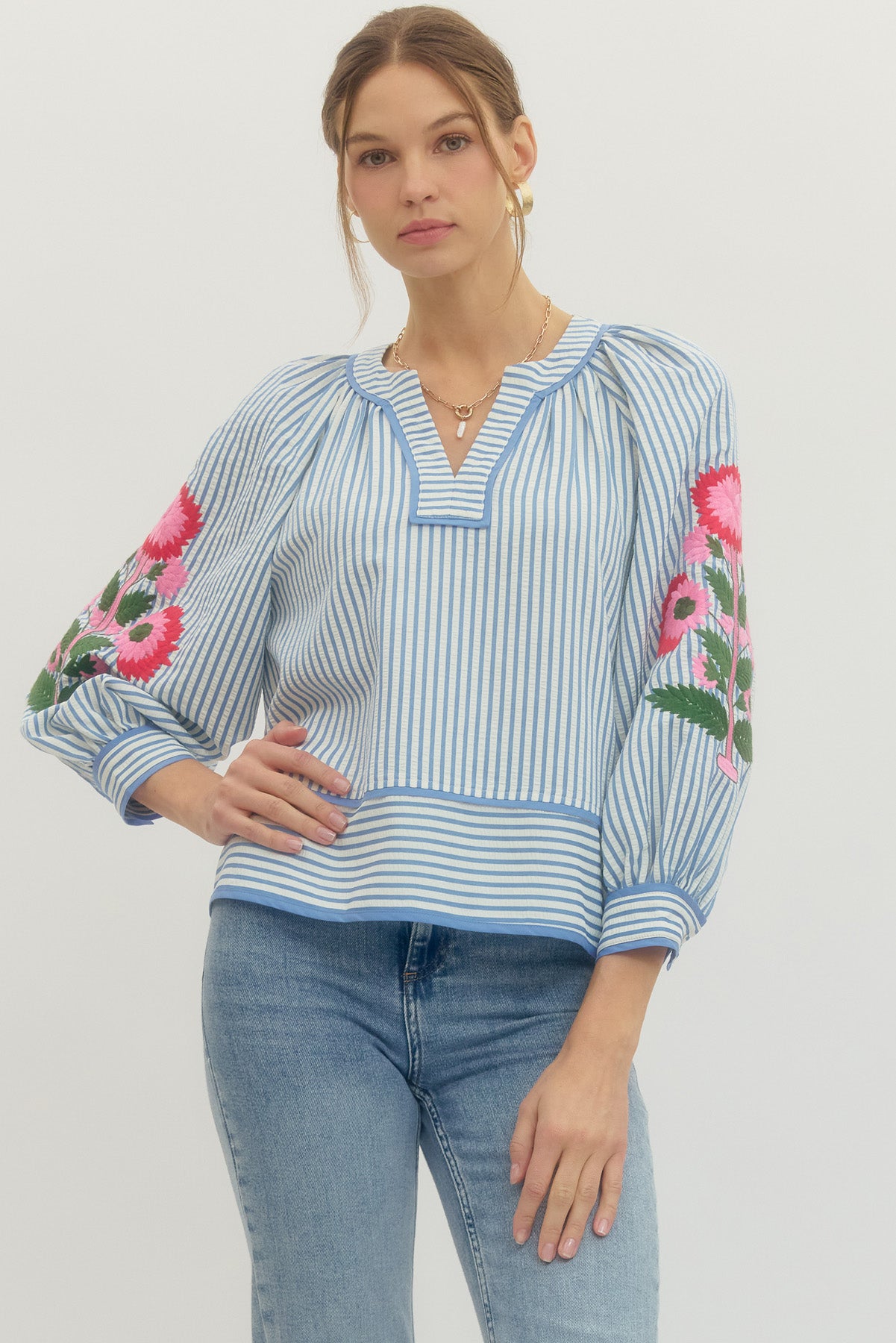 This top is the perfect addition to any wardrobe. The embroidered sleeves gives it that pop of color. Throw on a pair of white denim or your favorite pair of jeans and you will have the perfect outfit.