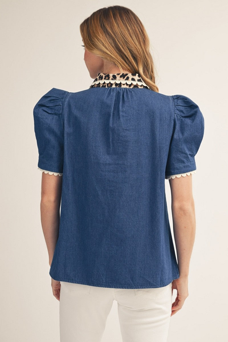 Short sleeves puff shoulder denim top with leopard contrast, scallop trim accent. - Model is 5'10'' and is wearing a Small.