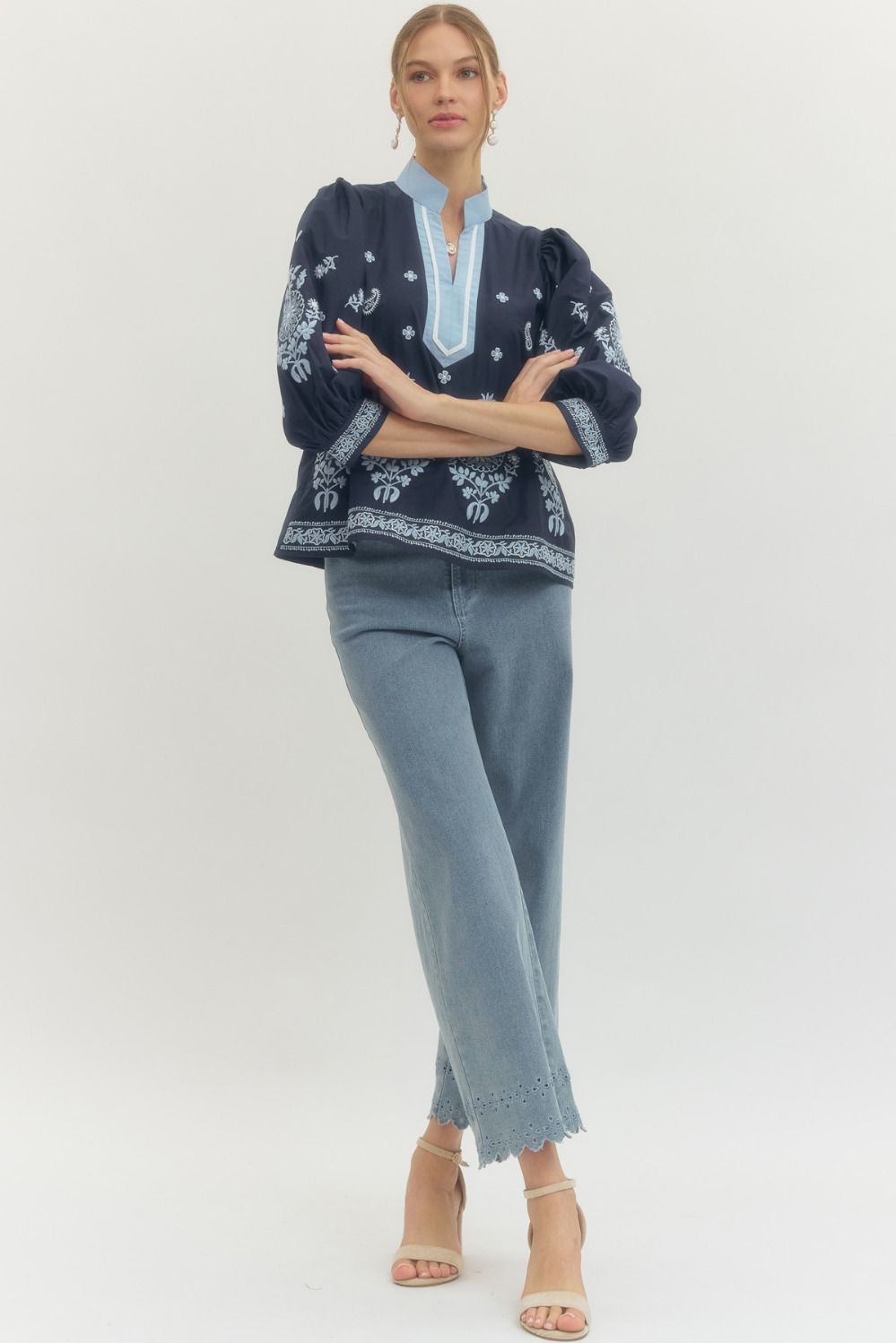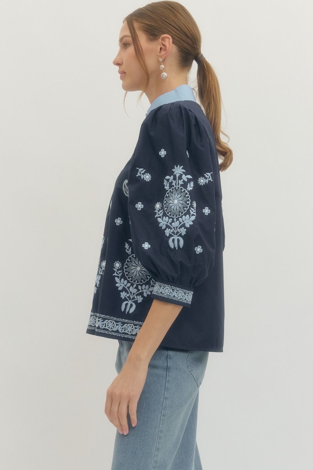 Floral embroidered 3/4 puff sleeve top featuring contrast V-neck band collar. Woven. Unlined. Non-sheer. Lightweight.