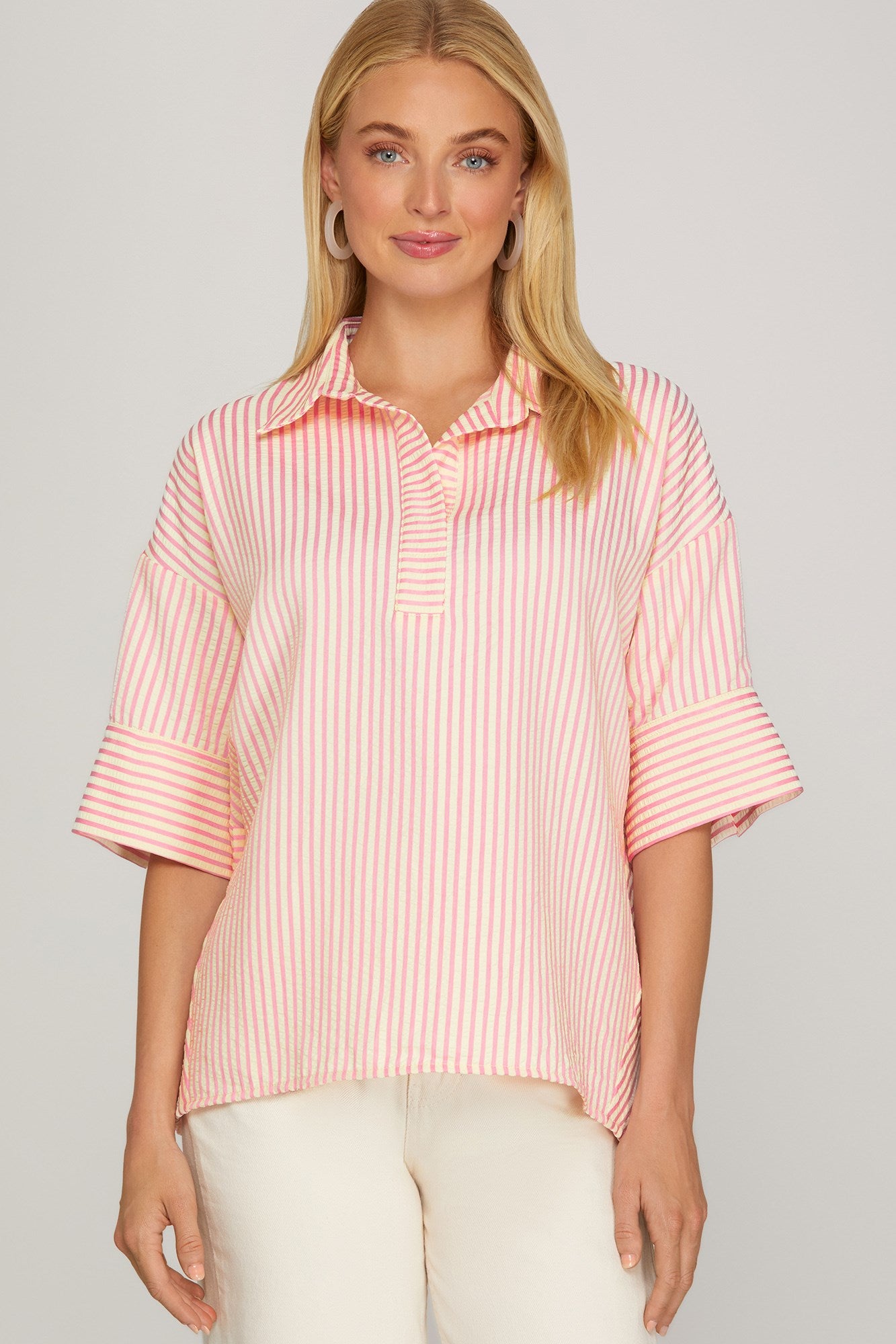 This top may become your Summer go to top.  It is perfect for work to play.  It has a relaxed fit and is a best seller.  It comes in two colors: Pink and Sage.