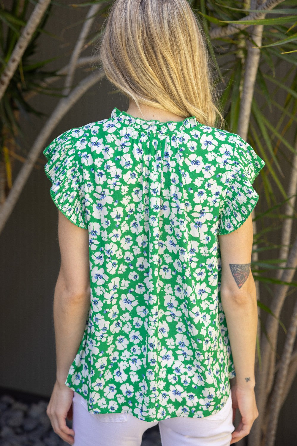 This is a great top for the warmer weather.  It is perfect for a day of play or a day at work.  The small ruffled neckline ties in the front.  The sleeve has a great ruffle to give it an updated look.