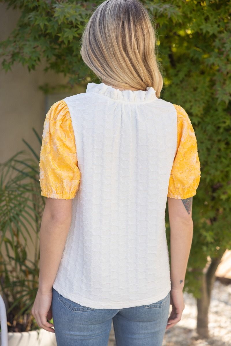 This top is perfect for some Summer or Spring fun. The light weight organza material makes it perfect for traveling. The body is a burnout organza sleeve with a knit body.