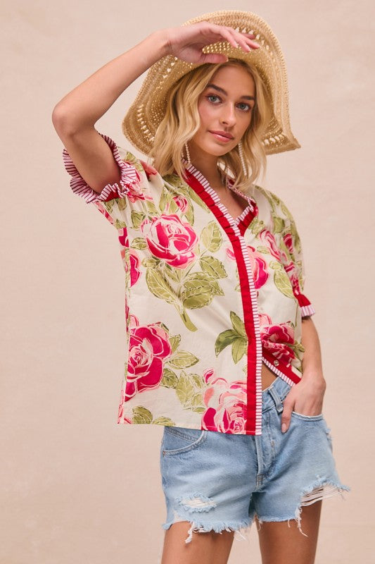 FLORAL PRINTED WOVEN CONTRAST EDGE RUFFLED BLOUSE