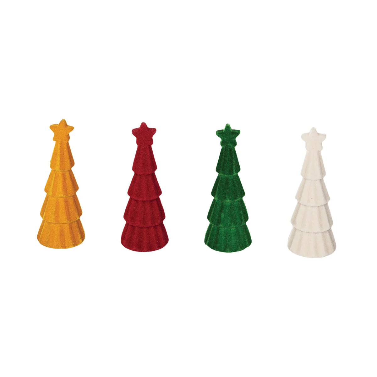 Bring holiday cheer into any home with this gorgeous flocked trees . These soft, velvety trees add a modern and tactile element to Christmas decor. Perfect for creating a whimsical forest scene on a mantel or tabletop, this assorted set offers plenty of ways to add festive flair to any home. It comes in four colors.