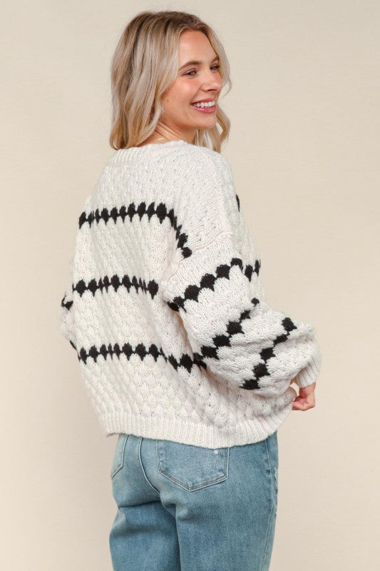 How cAn you go wrong with a black and white sweater. Its a classic that will never go out of style. Throw on a fun pair of colored pants and you will have a great look.
