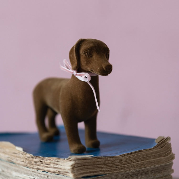 Description: 6-3/4"L Flocked Resin Dachshund w Bow, Brown & Pink