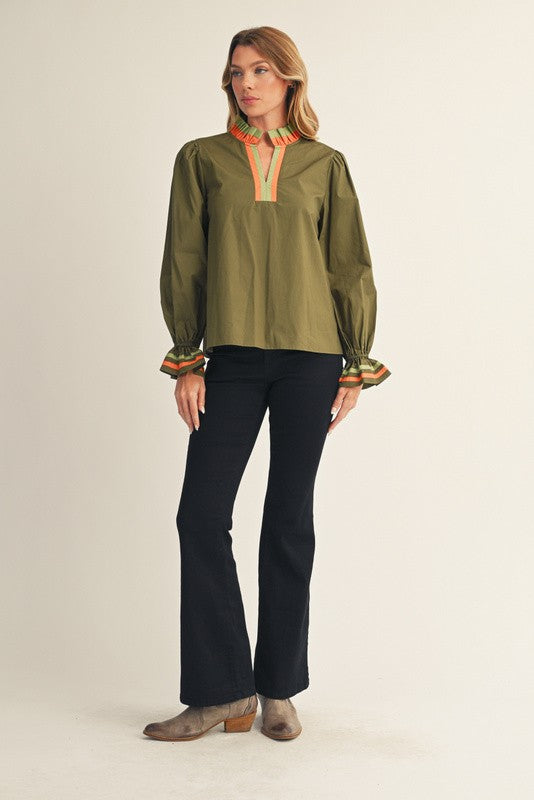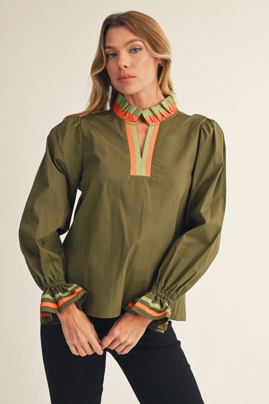 Ruffled long puff sleeves solid top with contrast accent, ruffled
